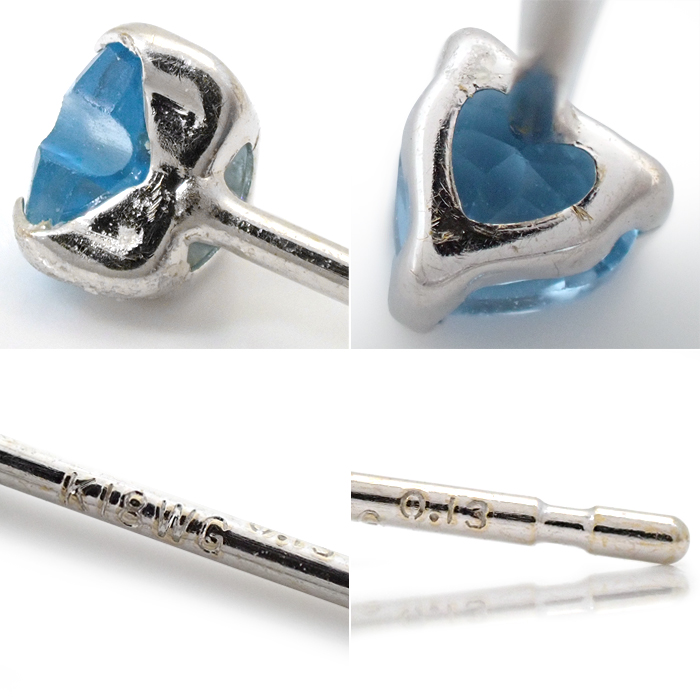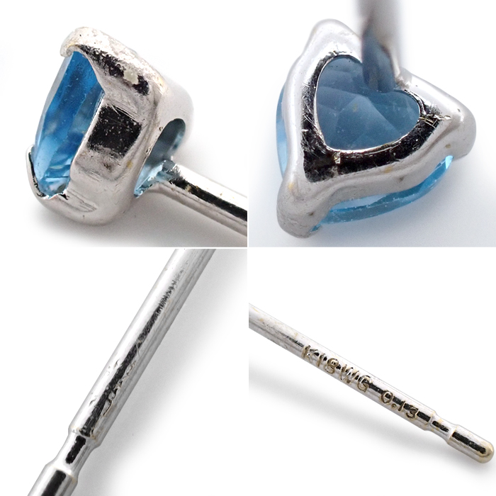| 詳細 | ブルートパーズ:0.13ct×2 重量:0.2g スタッドピアス(キャッチ式ピアス) ※宝石には10倍のルーペで確認できる天然特有のインクルージョンがあります。 ※K18WGには小傷やロジウムメッキの剥がれがあります。 ※画像の色の見え方は、お使いのモニターやディスプレイによって異なります。 |