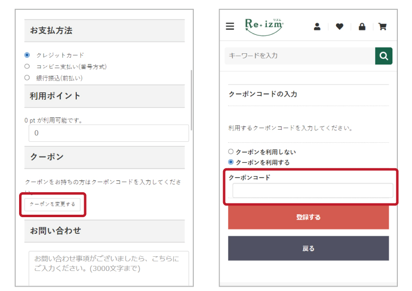 下部にあるクーポン欄の「クーポンを変更する」を押し、会員登録完了ご返信メールに記載されているクーポンコードをご入力し「登録する」ボタンを押してください。