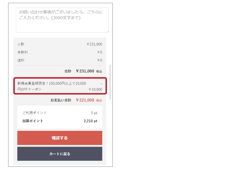「商品代金合計欄」に割引額が表示されていれば完了です。