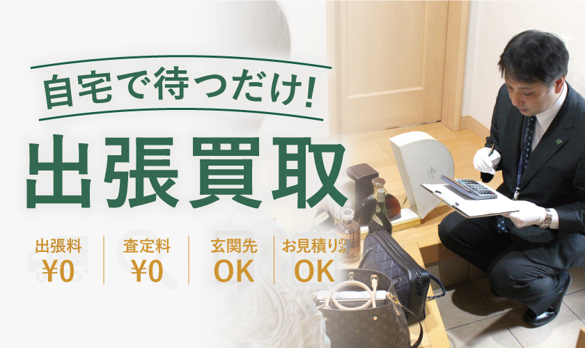 「売りたい物が沢山ある」「重くて運ぶのが大変」「お酒や食器など割れ物を運ぶのが不安」「宝石など高価な物を持ち出すのが心配」「家から出たくない」「なかなか店舗に行けない」などお悩みの方に便利な出張買取。お電話1本でご予約ができ、ご自宅で待つだけの手軽さからご利用されるお客様が多い買取方法です!