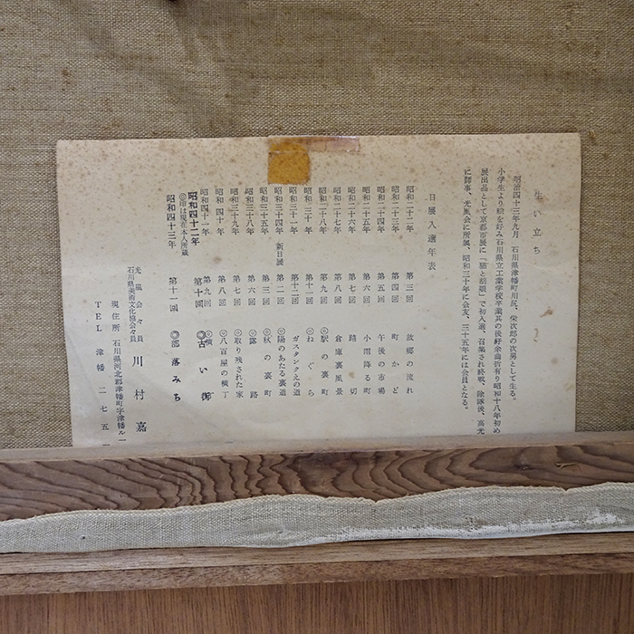 | 詳細 | 油彩 【川村嘉久】1910年 石川県河北郡津幡町生まれ。昭和4年石川県立工業学校図案絵画科卒業。18年京都市展に初入選。戦後高光一也に師事。22年日展初入選、以降47年まで出品。30年光風会会友、35年会員推挙。 |