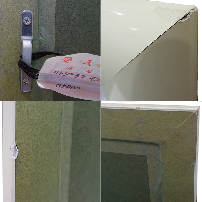 | 状態 | アクリルガラスには多少の小傷や汚れがあり、額縁には傷や汚れ、変色、欠け、当たり傷などがございます。また、背面部分は変色や破れなどがございます。 付属品の箱にも傷や破れ汚れなどのダメージがあります。 ※商品の状態に関しては画像にてご確認ください。 ※長期保管品の為、写真撮影部分以外にも細かなキズや汚れがある場合がございます。 |