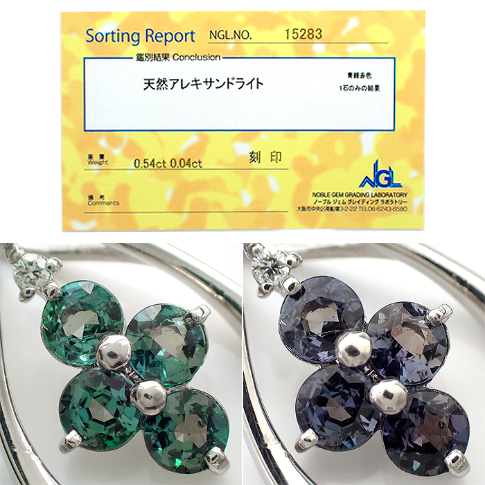 | 詳細 | アレキサンドライト:0.54ct ダイヤモンド:0.04ct 重量:4.5g トップ取外し可能 ※宝石には10倍のルーペで確認できる天然特有のインクルージョンがあります。 ※新品仕上げ済みですが、Pt900に僅かな小傷、Pt850には小傷やくすみ・変色などがあります。 |