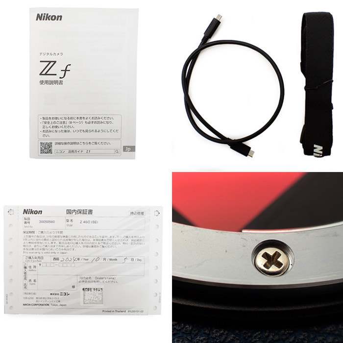 | 付属品 | アクセサリーシューカバーASC-06・接眼目当てDK-33・ボディーキャプBF-N1・Li-ionリチャージャブルバッテリーEN-EL15c(端子カバー付き)2・ストラップAN-DC27・USBケーブルUC-E25・使用説明書・保証書・箱・レンズNIKKOR Z 40mm f/2 (SE) ・レンズキャップ・リアキャップ |