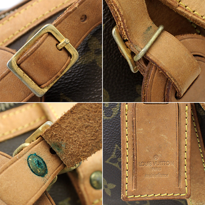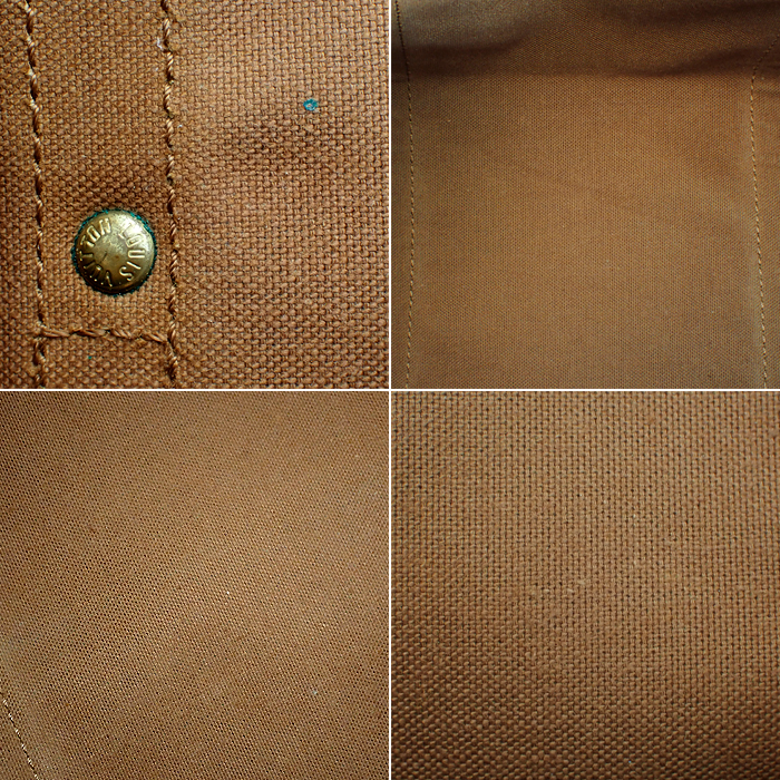 | 状態 | ヌメ革にヤケ・シミ・汚れ・スレ・傷・割れ・シワ等があります。 キャンバスには僅かな汚れ・小傷等、内側には傷や毛羽立ちがあります。 金具には小傷・くすみ・メッキ剥げ・青錆があります。 |