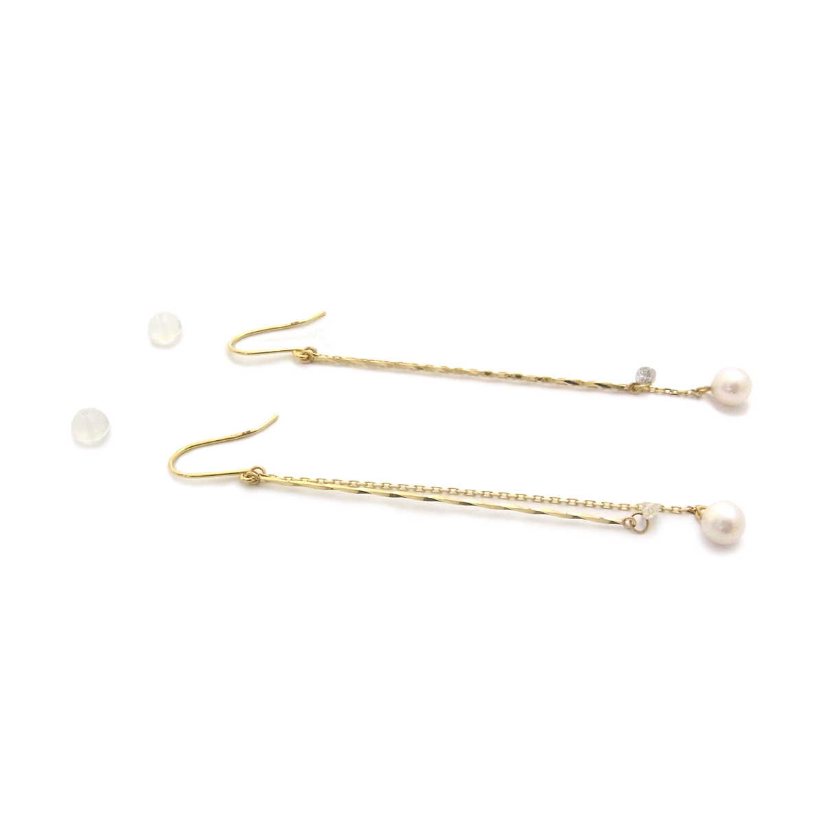 | コメント | ロングピアスのご紹介です。振動が伝わりやすいチェーンの先にはベビーパールがあしらわれ、バーの先のダイヤと共にチラチラと揺れ動く様がとっても可愛らしいデザインです♪ |